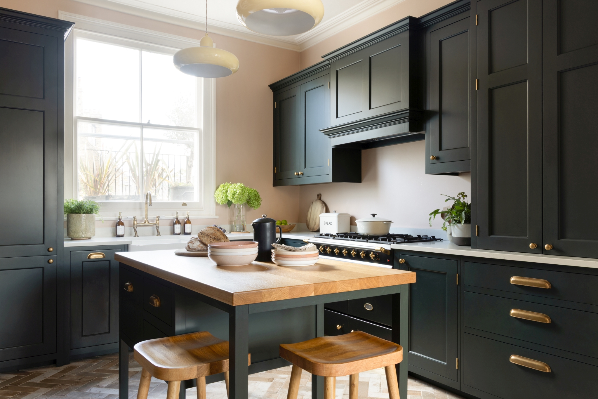 A framed Shaker kitchen in Little Greene Pompeian Grey, paired with antique brass detailing and a striking black bar area for a refined yet confident finish.