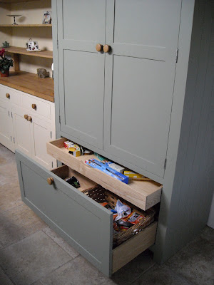 It can spoil the look of a cupboard to have a thin external drawer and larger one below so we think the drawer within a drawer concept can look nicer. Yes it can be a pain having to open two drawers to get at the contents but sometimes you have to go for aesthetic over functional.