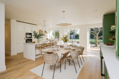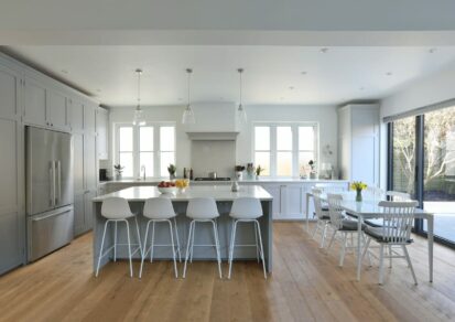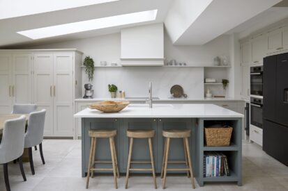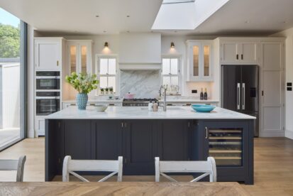 This Herne Hill shaker kitchen showcases timeless elegance with a harmonious flow between kitchen and living spaces.