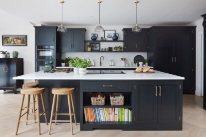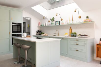A contemporary take on an elegant shaker kitchen in a radiant grey green.