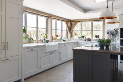 An airy and radiant contemporary shaker kitchen with charming classic details.