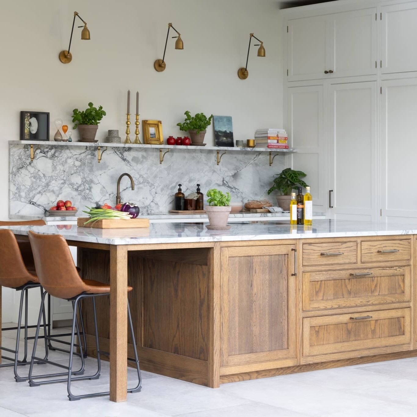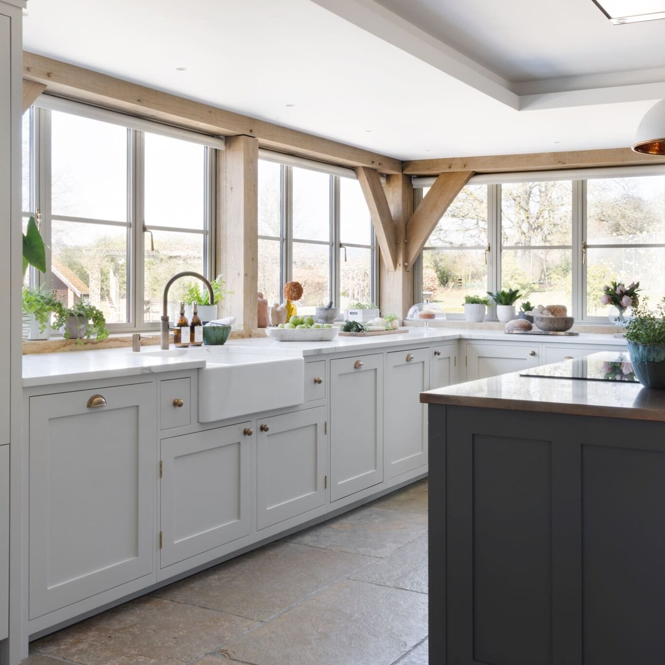 The framed shaker style Balham kitchen offers a timeless design that feels contemporary. Painted maple doors with ply panels are paired with painted tulipwood frames for strength and refinement, while solid oak drawers and a lacquered oak veneer ply carcass bring depth and durability. Antique brass handles add a touch of understated luxury, tying together the cabinetry with subtle detailing, maintaining that classic touch. Finished in Santorini Sands, a unique colour mix by Little Greene Paint Company for Higham, with walls in Lick Taupe, the warm palette creates a calm and inviting atmosphere.