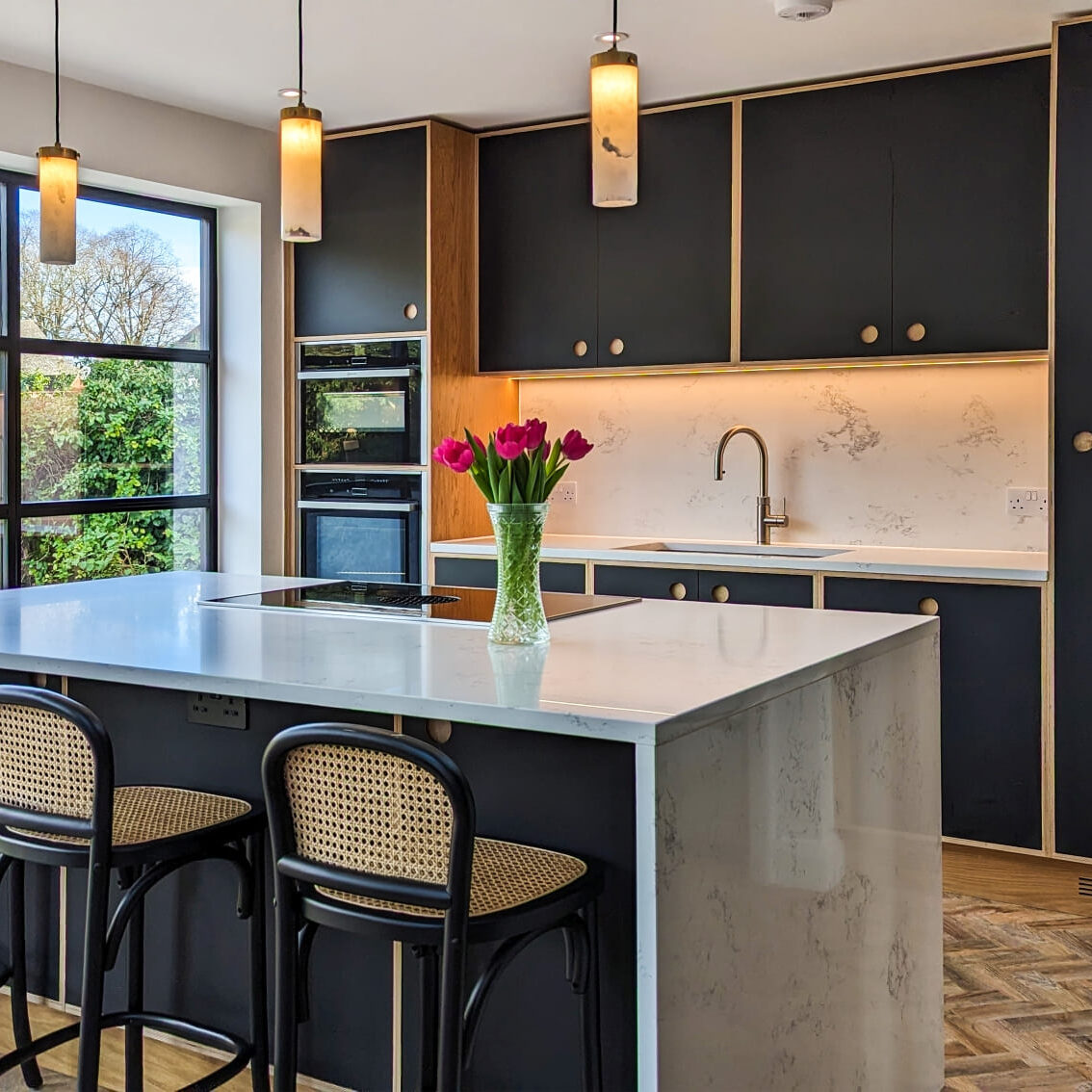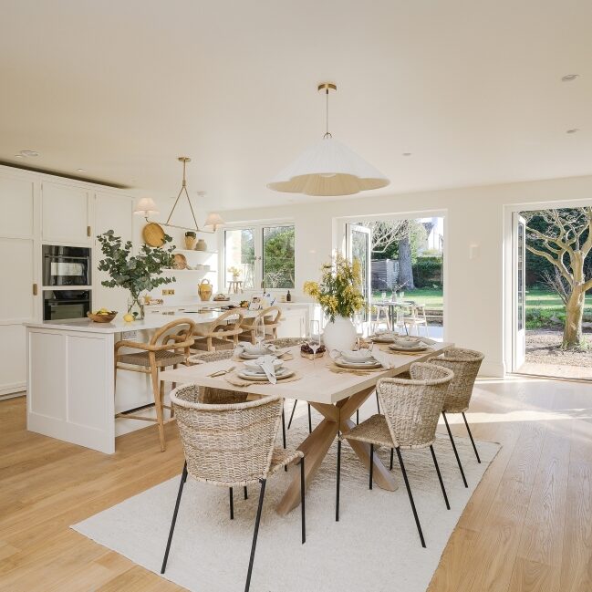 At the centre of the room sits a generous island with a HS Calacatta Luna worktop, paired with weathered oak stools from Rose & Grey to create a space for the whole family to enjoy. Overhead, Industville Chelsea Glass Dome pendants highlight the island, complemented by Cox and Cox Var wall lights. The flooring, laid in engineered oak chevrons in a Silver White oiled finish from The Wood Flooring Co., grounds the room with a light and contemporary foundation.