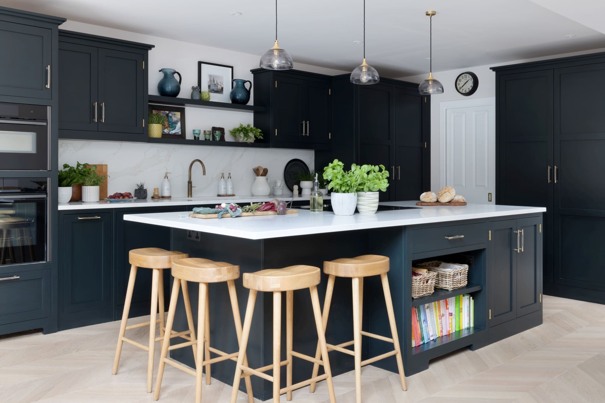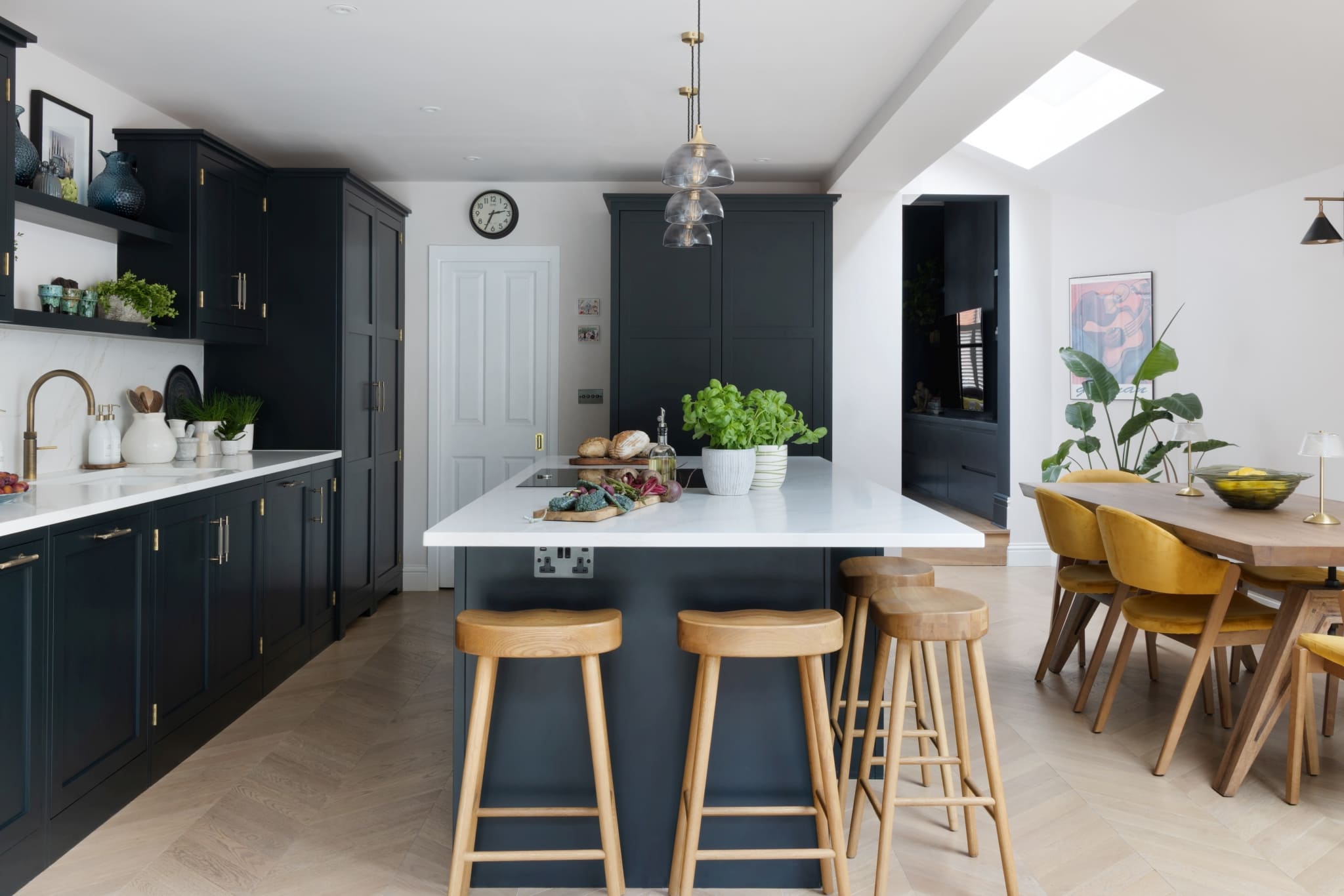 At the centre of the room sits a generous island with a HS Calacatta Luna worktop, paired with weathered oak stools from Rose & Grey to create a space for the whole family to enjoy. Overhead, Industville Chelsea Glass Dome pendants highlight the island, complemented by Cox and Cox Var wall lights. The flooring, laid in engineered oak chevrons in a Silver White oiled finish from The Wood Flooring Co., grounds the room with a light and contemporary foundation.