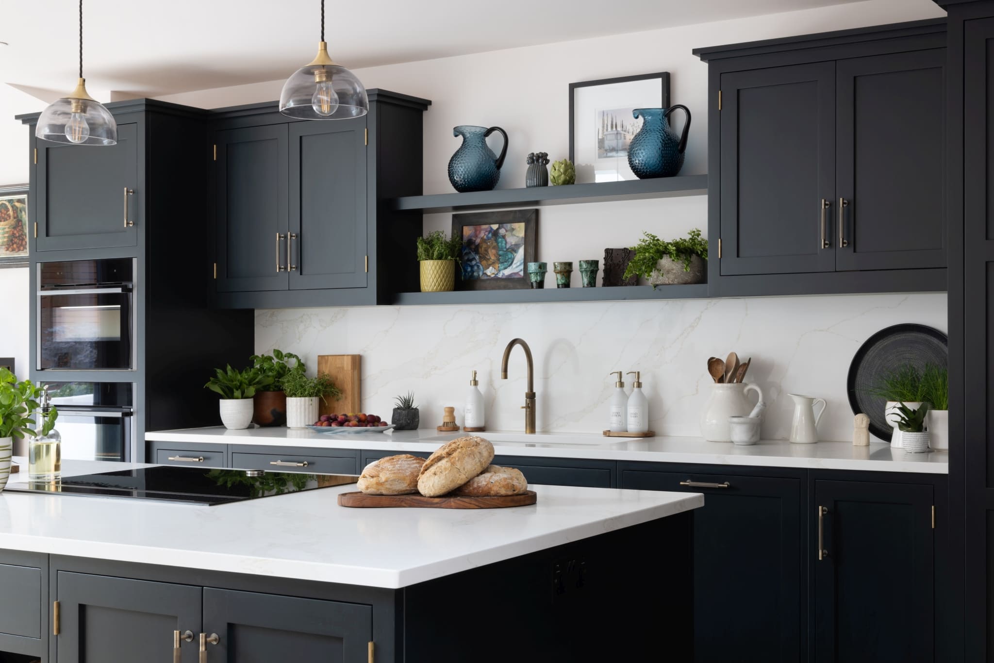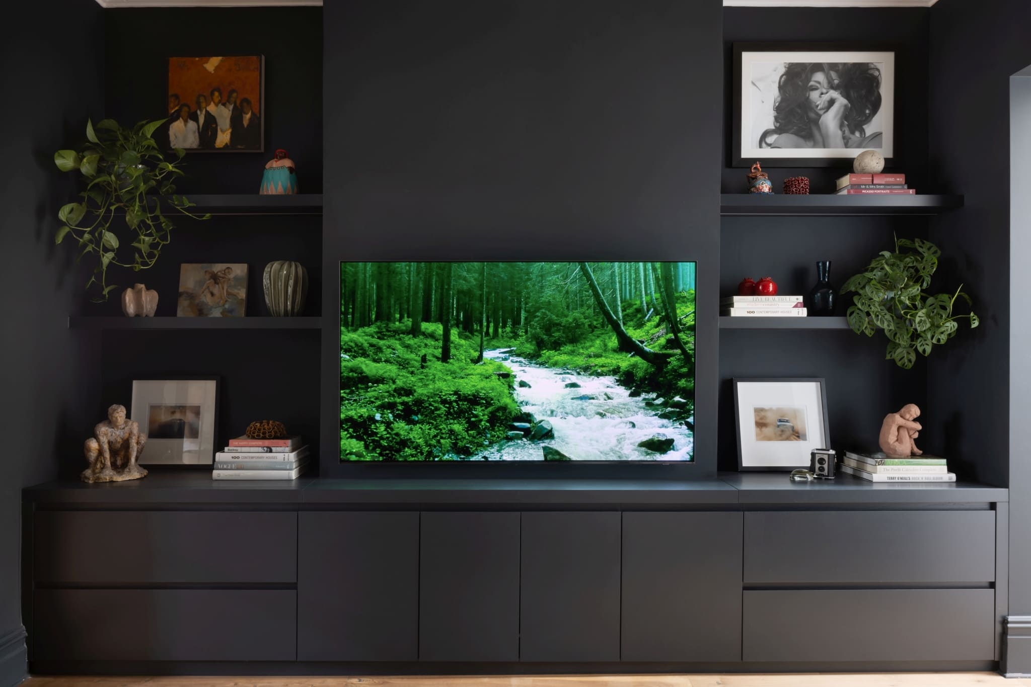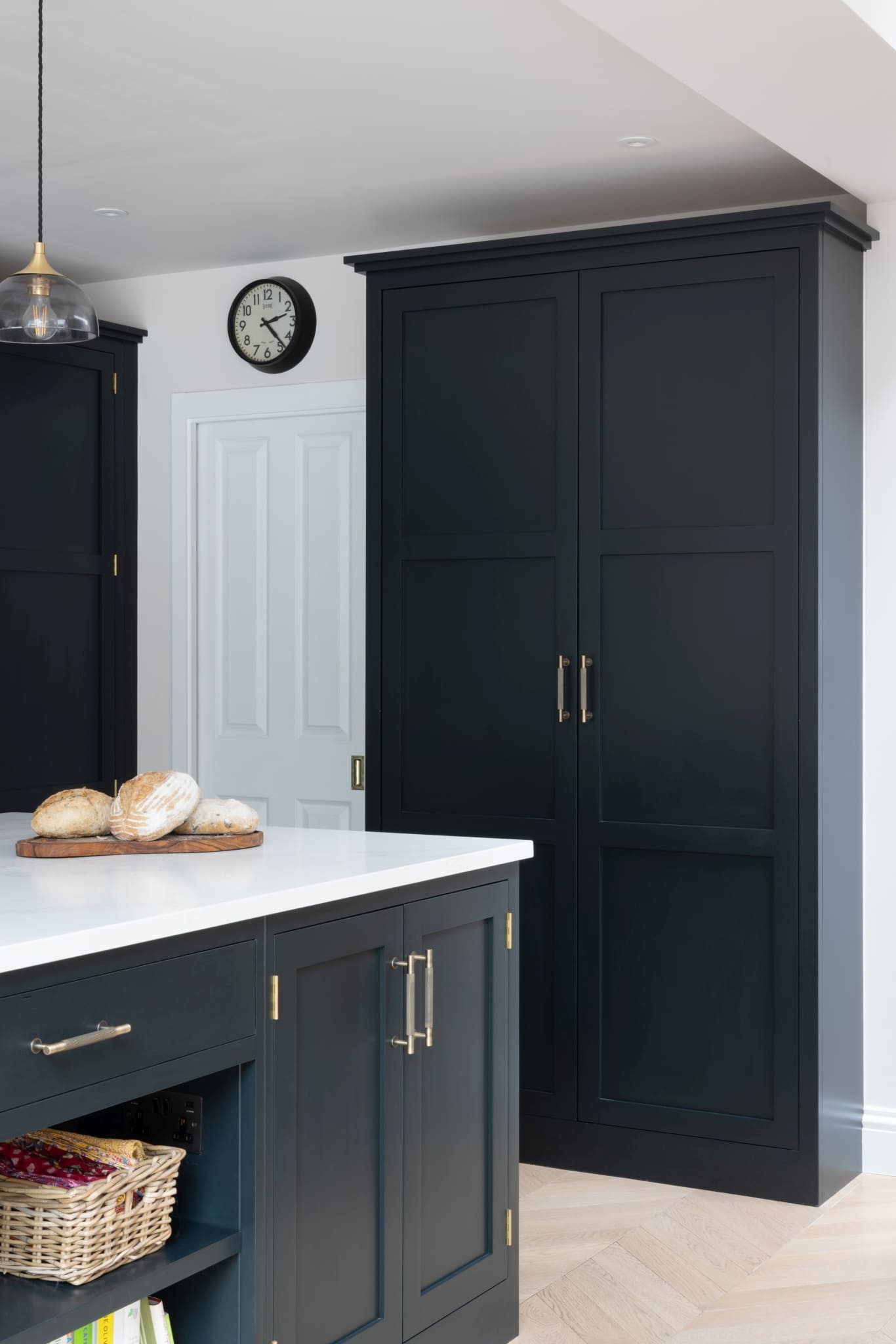 In the adjoining living space, a bespoke Planton-style media unit provides a complementary counterpoint to the kitchen, painted in F&B Railings. A handleless raked design gives the piece sharp, architectural lines, while the richness of American walnut flooring, stained and finished with Bona Mega Natural, grounds the piece. The result is a cohesive project that unites kitchen and living areas with consistent craftsmanship, thoughtful material choices, and a balance of elegance and practicality tailored for modern living.