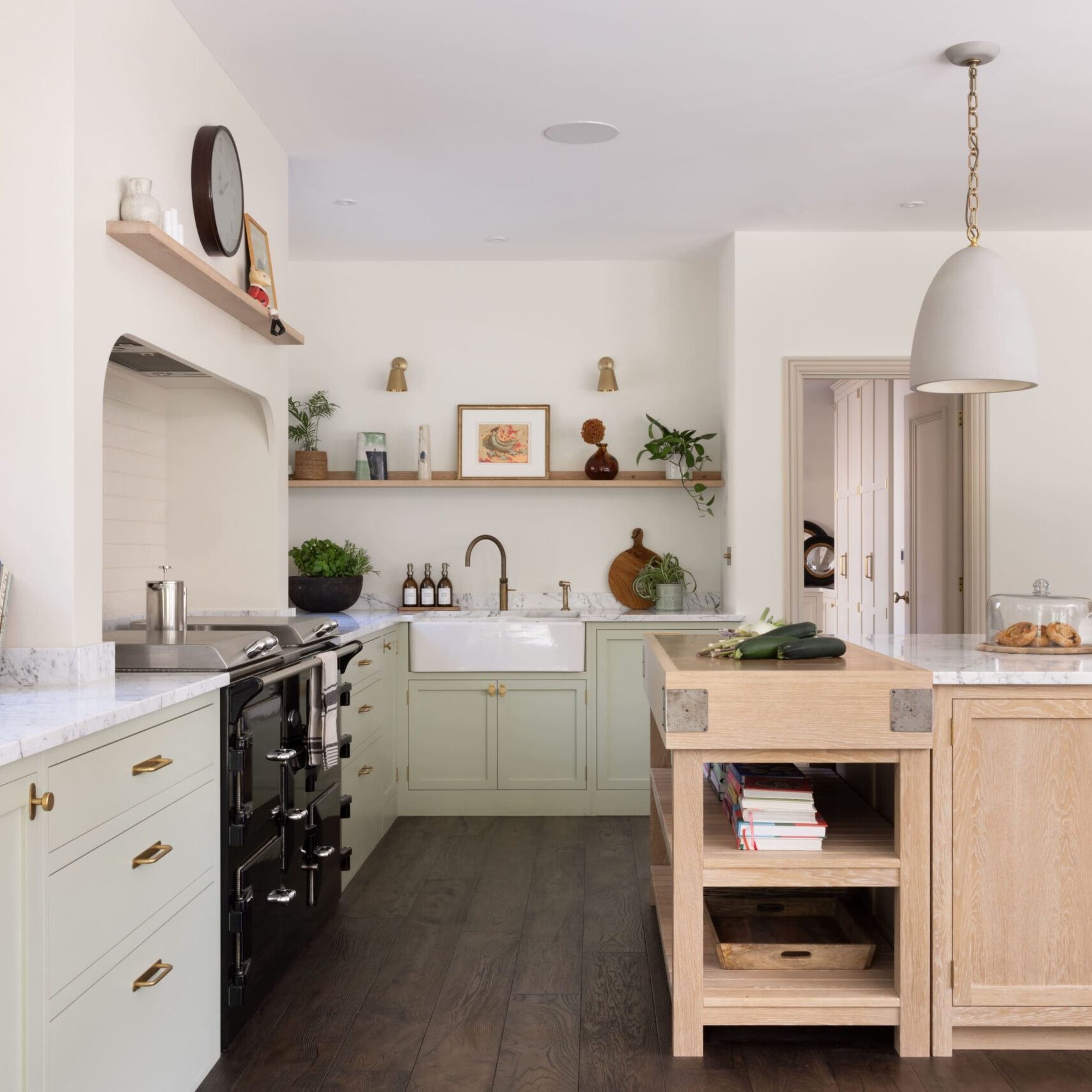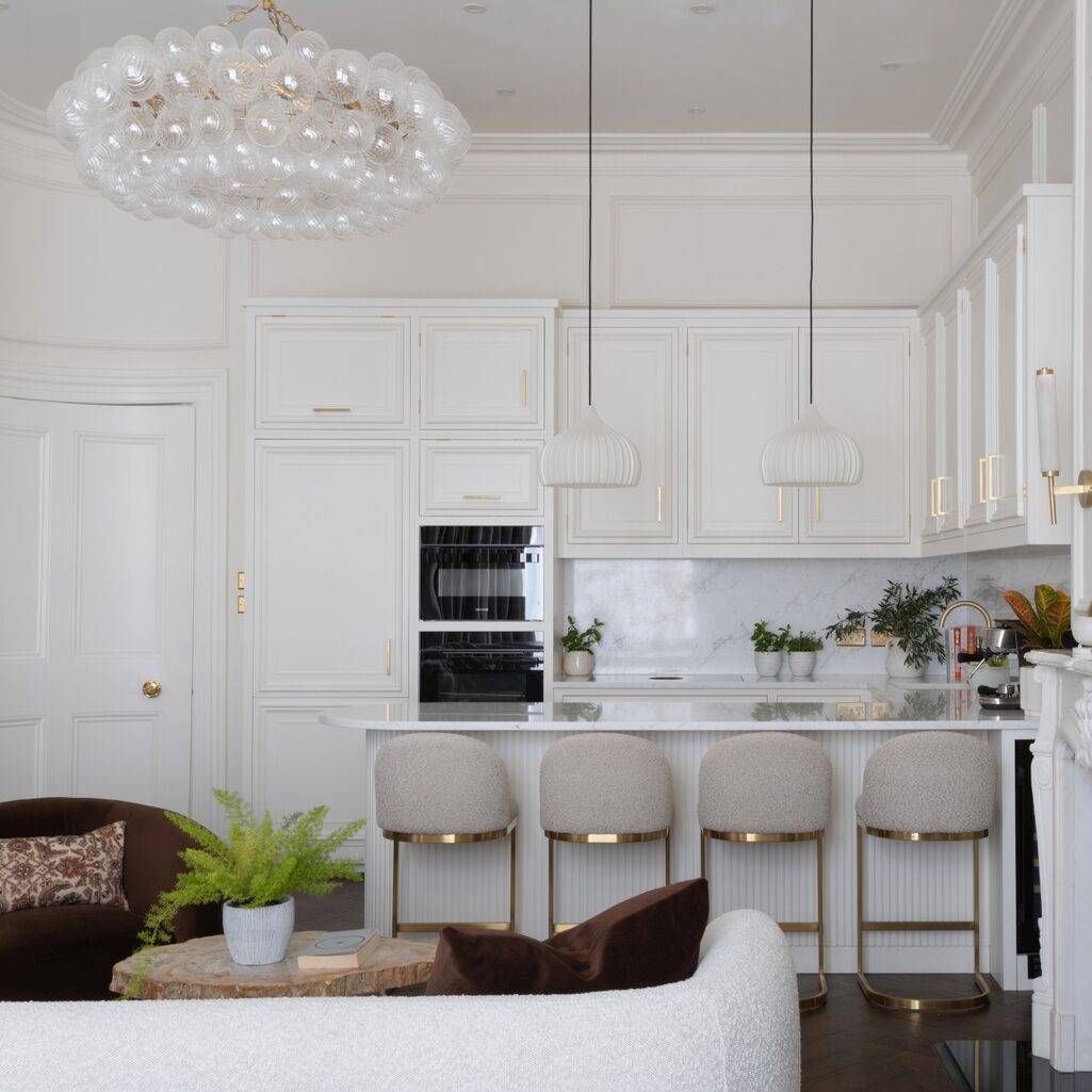 The colour palette pairs Little Greene Aquamarine 138 cabinetry with Farrow & Ball Wevet walls, bringing softness and clarity to the space. A Pure White Lines Moscow Chandelier and Pooky wall lights provide layered lighting, while Artisan of Devizes Wychwood Limestone flooring adds warmth underfoot. Furniture pieces—Magis Bombo Stools, Eames Vitra dining chairs, a marble-topped table and Aria’s 366 Concept chairs in powder pink boucle—round out the room with understated character.