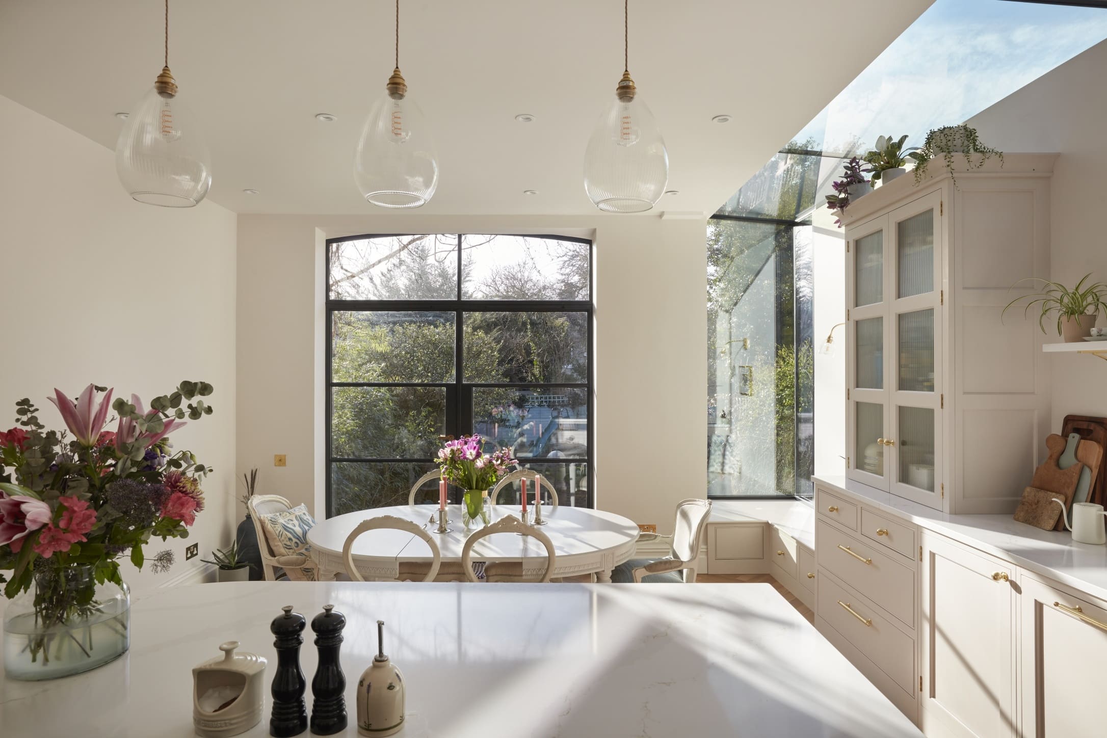 This thoughtfully designed kitchen and adjoining dining space combine timeless elegance with a practical layout, showcasing a soft, neutral colour palette and luxurious materials. Featuring intricate glass moulding, this space is crafted to offer a harmonious blend of classic design and modern convenience, tailored for an elegant and inviting home environment.