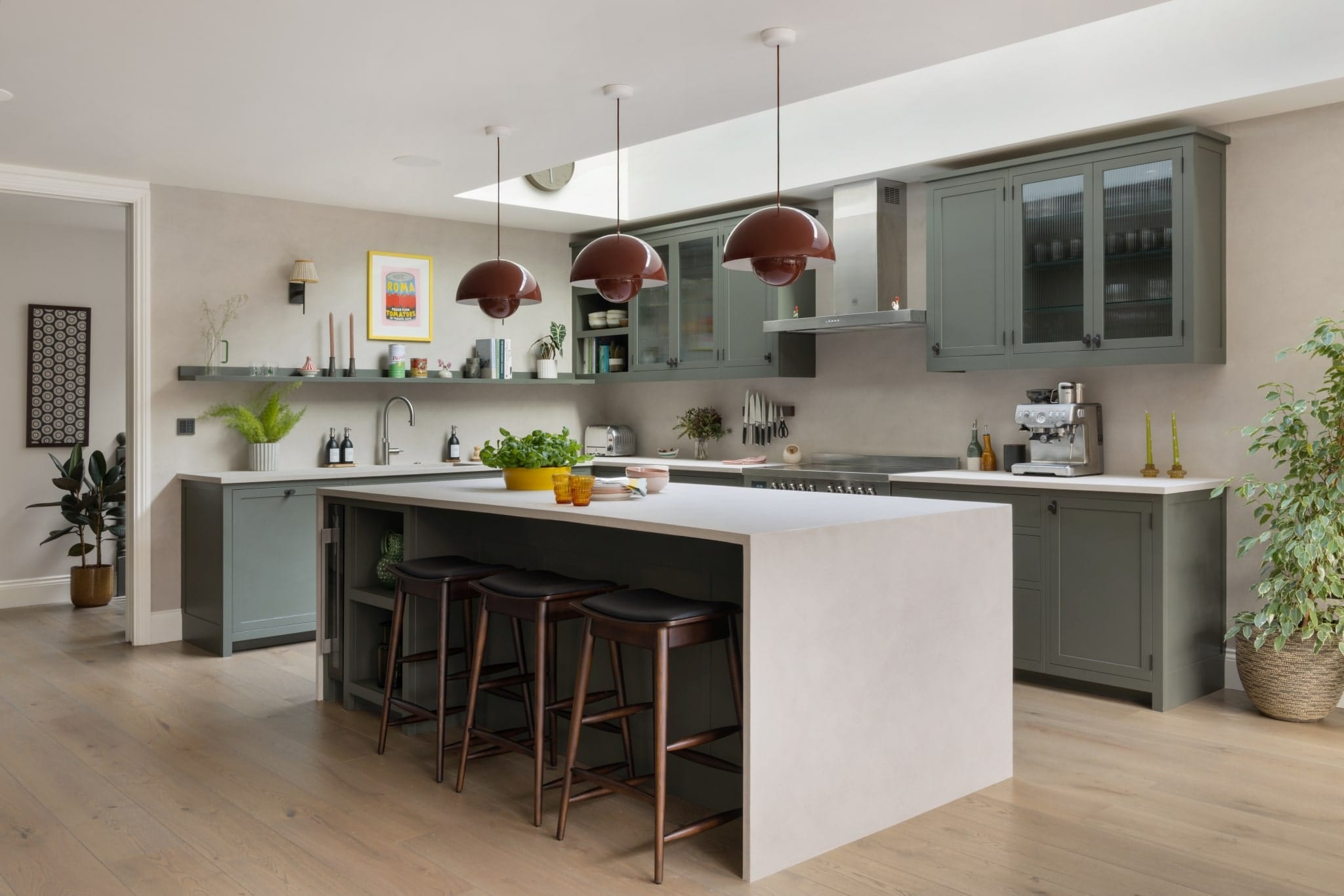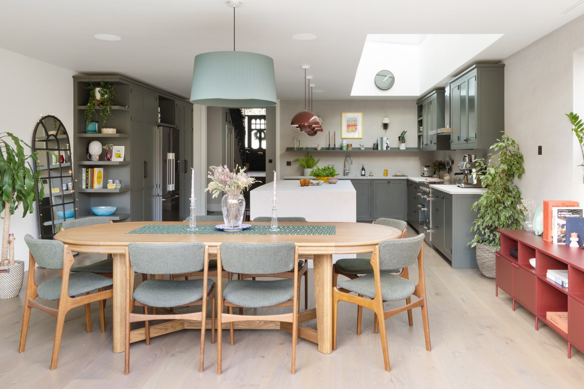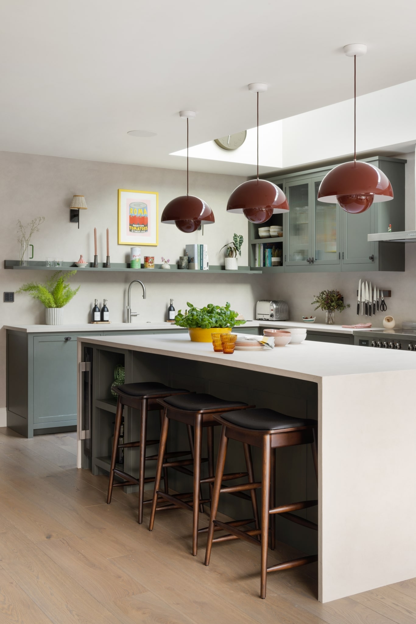 The island stands out in a crisp, white tone, while the vermillion red flowerpot pendant lighting hanging above adds a captivating touch. Dark grey tones on the main cabinetry, with Corston Kilburn Furniture handles, create a serene ambience that harmonises with the wooden flooring and modern Loop and Twist Hans stools in dark walnut.