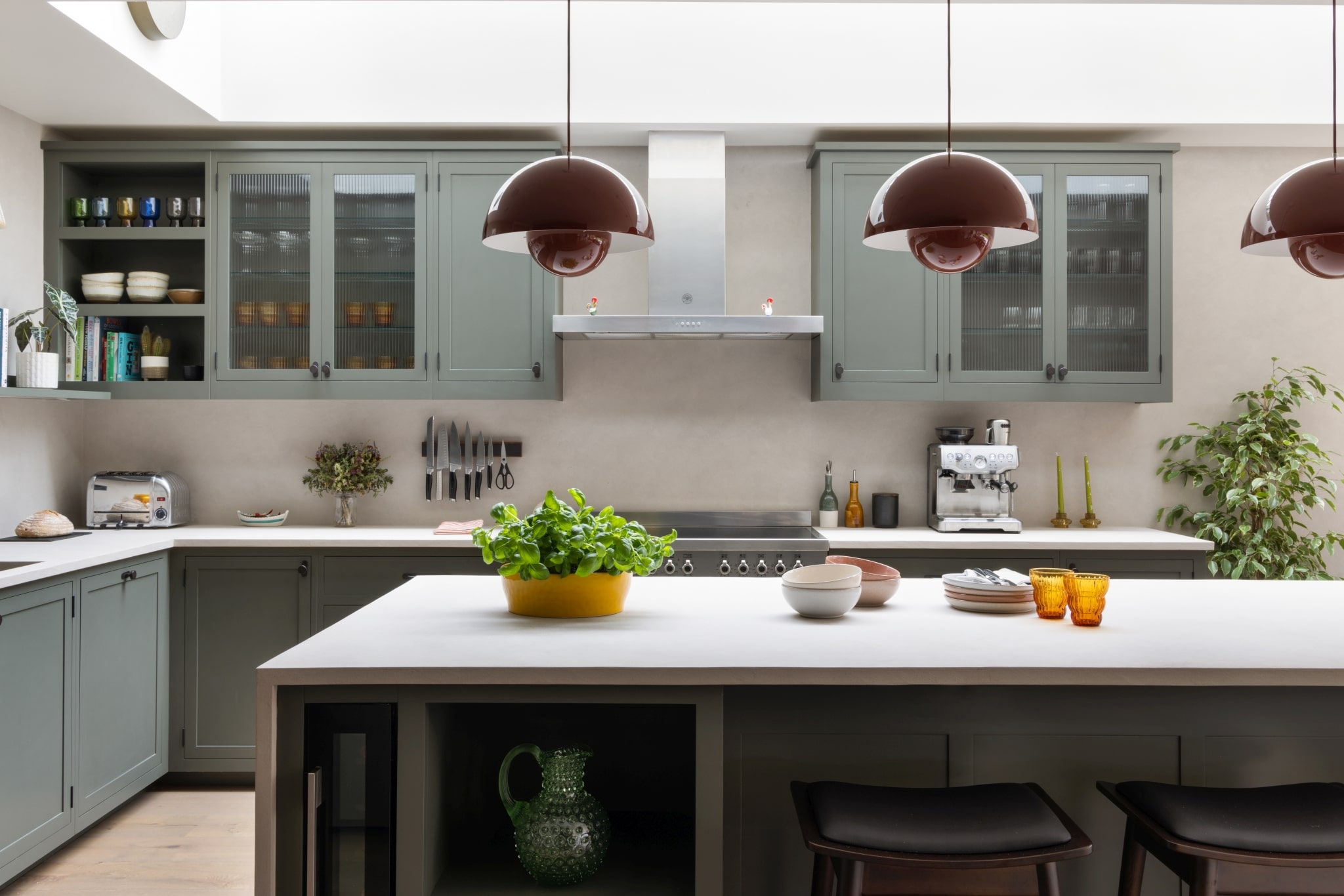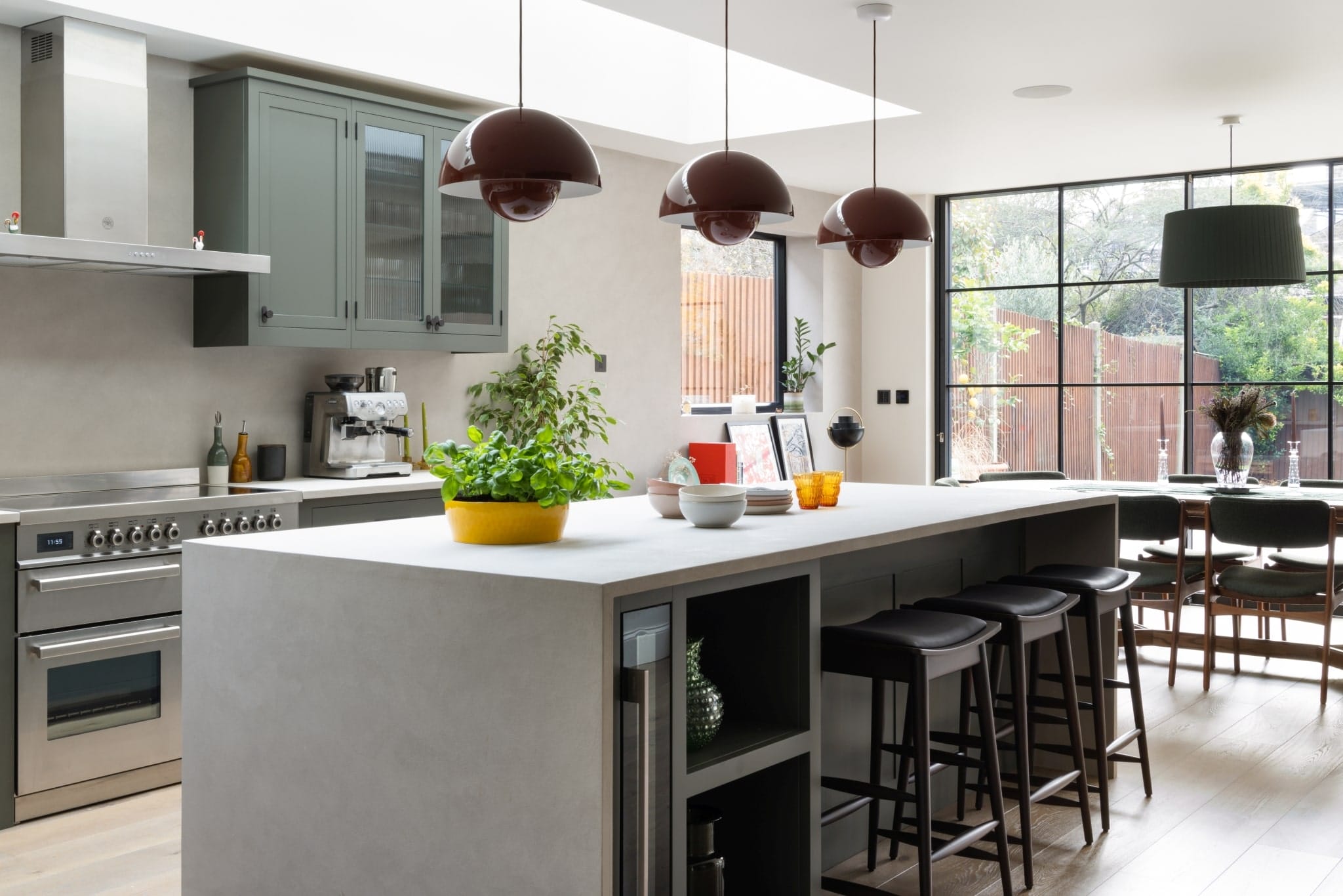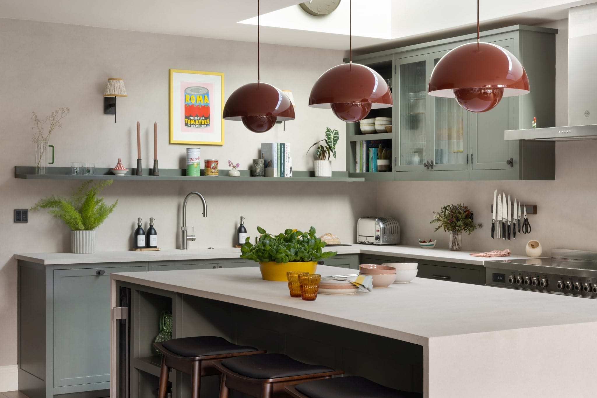 The island stands out in a crisp, white tone, while the vermillion red flowerpot pendant lighting hanging above adds a captivating touch. Dark grey tones on the main cabinetry, with Corston Kilburn Furniture handles, create a serene ambience that harmonises with the wooden flooring and modern Loop and Twist Hans stools in dark walnut.