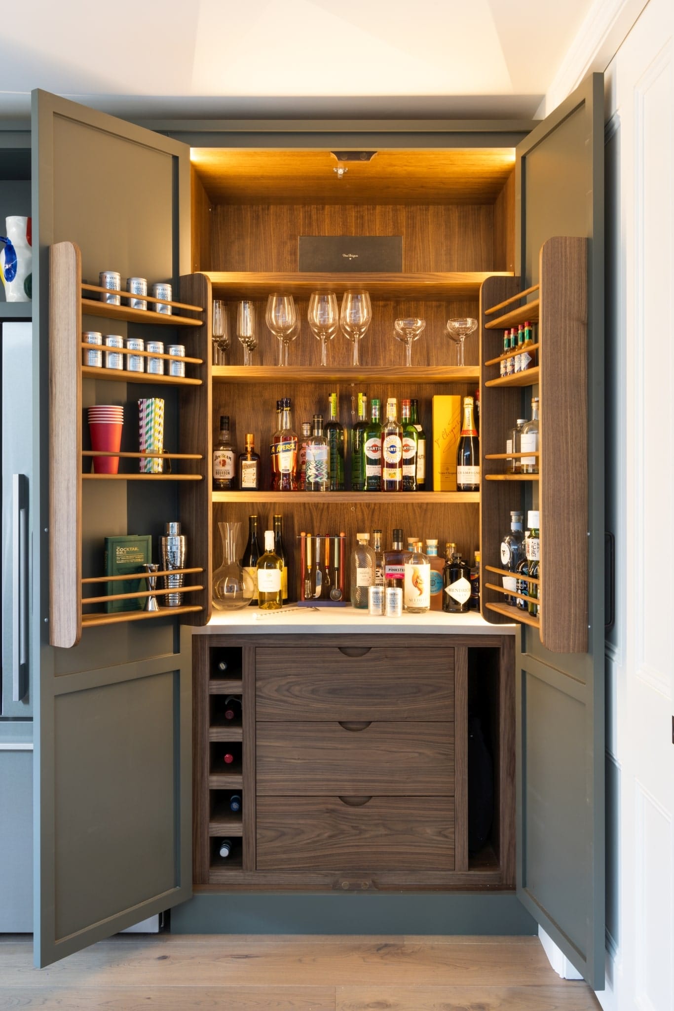 - Materials: Walnut veneered ply interiors with maple-painted doors